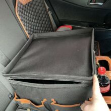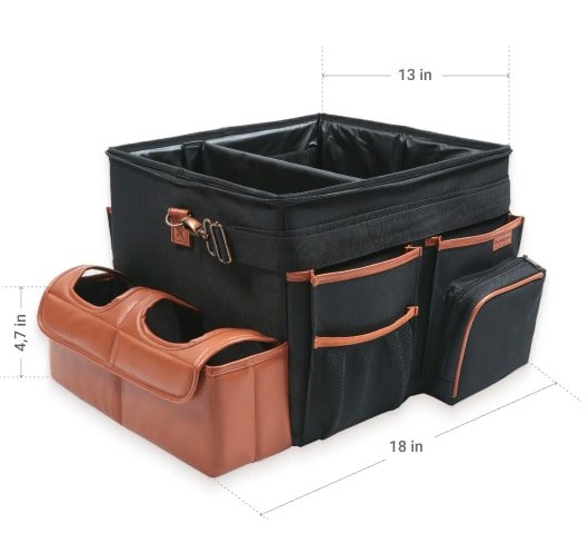 This organizer is fully collapsible and made from high-quality materials including PU leather, 600D Oxford, non-slip bottom, and waterproof lining. Store it easily in your trunk, in the front or back seats – it fits perfecly between two child seats!