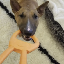 My bull terrier LOVES this toy. Her second favorite game is tug and this is hands down the best tug toy I've ever bought. It's really springy so playing tug doesn't hurt my back and I can play with her longer. She's soooo happy. It's been 8 months and this toy is still going strong. I'm shocked, actually. I also found another great benefit: this toy is perfect for a teething puppy. I adopted a 4 month old bull terrier and he's a chewer. This is his favorite teething toy. The soft rubber is perfect to relieve the teething frustration without damaging the baby teeth. And he can't do any damage the toy, either. We have several sodapup toys, but this one in particular is shaped perfect for teething chewing.
